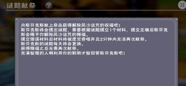 以上就是小编给大家带来的创造与魔法解除风沙献祭问题答案大全的攻略了,想知道更多创造与魔法相关攻略的话,记得关注