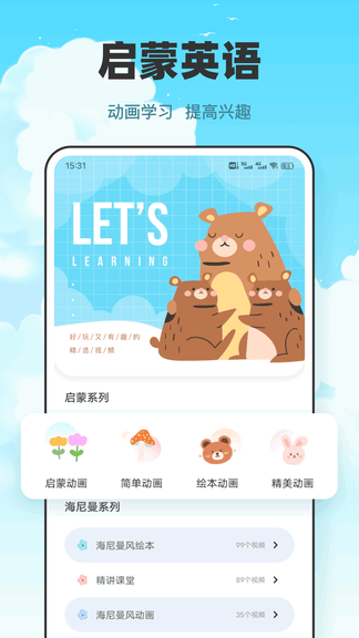 精选英语启蒙系列,动画学习,海尼曼绘本学习,实用英语学习,各种不同生活工作场景英语,全面辅助!想要提高英语水平?不要担心!英语单词每天专注学习,设定学习单词目标,提高学习效率。让你获得沉浸式学习体验!快来一起学起来!