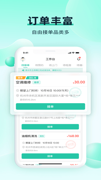 抢单模式:师傅可自主选择订单,适合时间灵活的个体从业者。