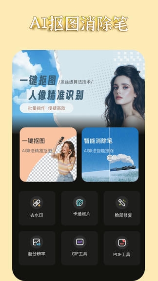AI 抠图消除笔app是一款集成 AI 智能抠图与物体消除功能的移动端图片编辑工具,由深圳市芙玥嘉科技有限公司开发,软件支持一键精准抠图 + 智能物体擦除,辅以多种图片美化工具,让普通用户也能轻松实现专业级P图效果,海量特效火爆视频,一键视频去水印。消除照片和视频的文字水印、美化图片、视频。软件操作简单,自带AI 赋能效果出色,拥有非常功能全面,是手机端不可多得的图片编辑神器,特别适合社交媒体分享和电商场景。