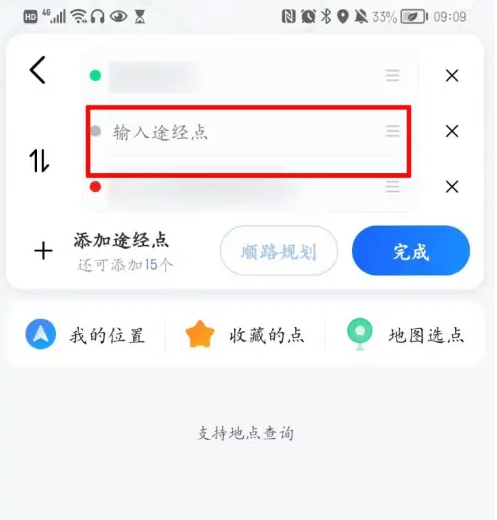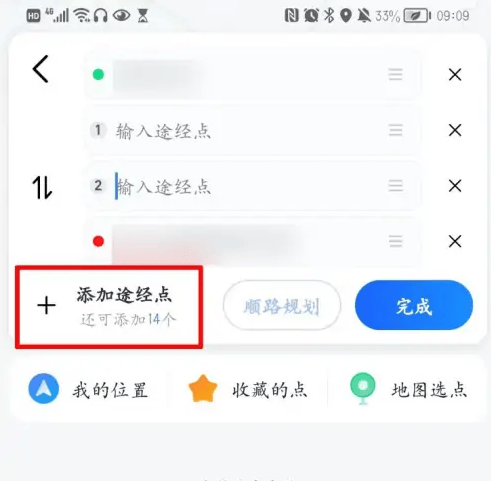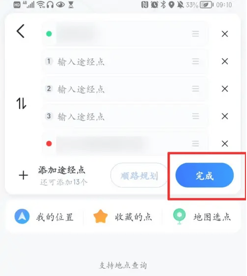 添加完毕后,点击完成,即可获取经过途径地点的路线。