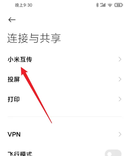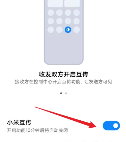 进入到连接与共享界面,点击“小米互传”右侧按钮开启。