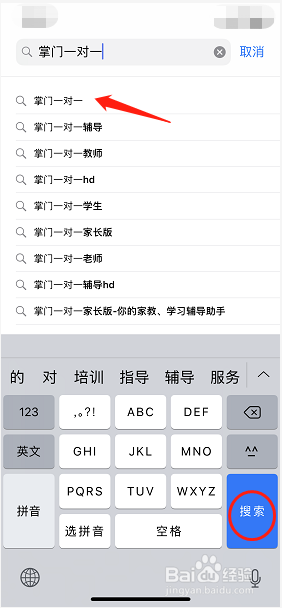 然后进入搜索界面,在搜索框内输入掌门1对1辅导的文字内容,点击搜索。