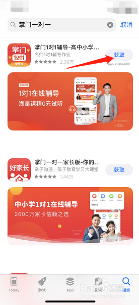 这时会跳转界面,界面上显示的有掌门1对1辅导的APP,点击旁边的<获取>就可下载该APP,下载完成后右侧显示<打开>字符就代表下载成功了。