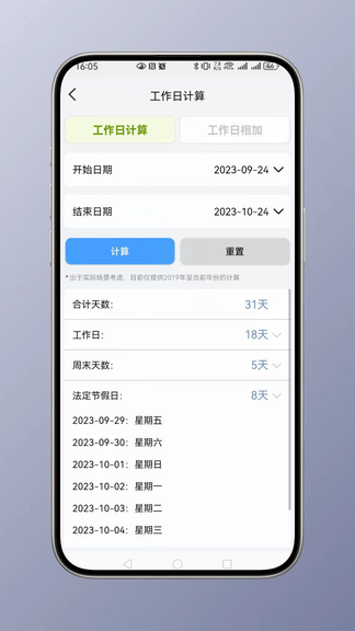 可以选定开始日期、输入相加天数、选择作息方式(单休、双休)即可计算出相加后的具体日期