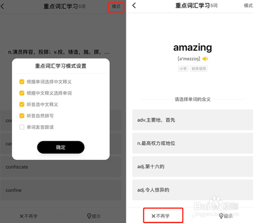 在【重点词汇学习】部分,从模式设置上可以看出共有5种学习方式,自定义学习方式为4种。在学习过程中,左下角有【不再学】选项,对已经掌握的单词可以直接Pass。