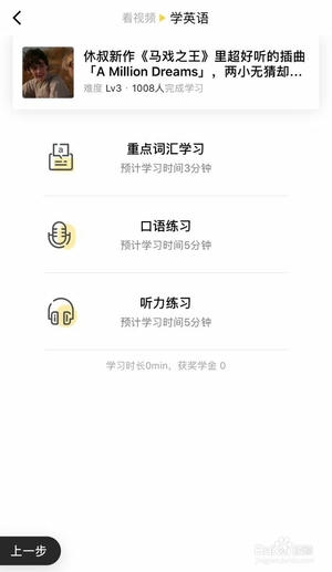 看完学习视频后,就进入了学习部分。学习部分由三部分组成:重点词汇学习、听力练习、口语练习。如果你只想训练某个薄弱项,直接点击想训练的部分即可。