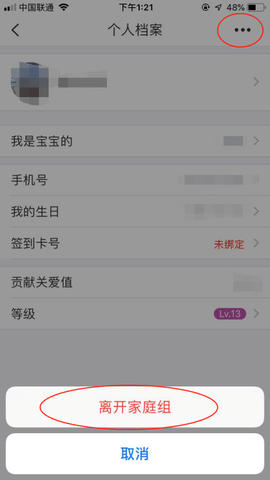 2、在个人档案页面中点击右上方,出现“离开家庭组”,点击即可删除。