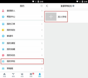 2、也可以进入【我的】页面点击【我的学校】,选择【添加学校】;