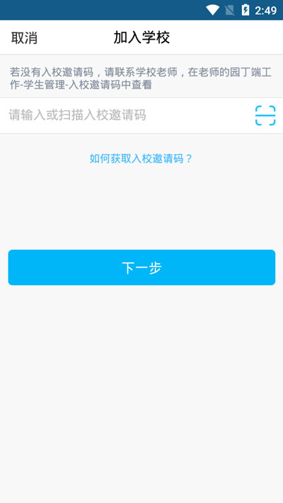 3、进入到加入学校页面之后,输入从老师的园丁端(工作 - 学生管理 - 入校邀请码)中或者班级ID,入校邀请码;