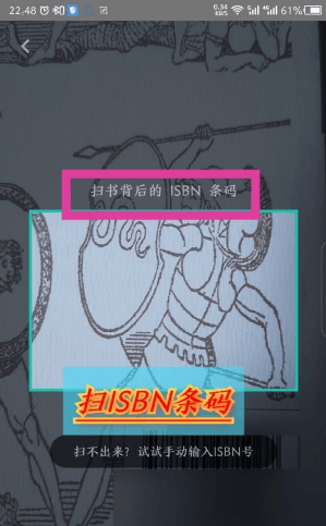 然后在打开的摄像头界面,扫书背后的ISBN条码,也可以手动输入。如图所示