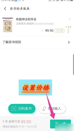 扫码成功识别后,能看到卖的书,可以设置卖书的价格,点击下一步。如图所示