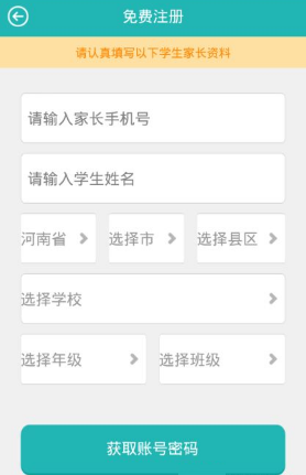 在注册界面中,输入家长手机号,学生姓名,选择学校及年级班级等,点击获取密码即可,目前仅支持河南省学校。
