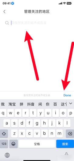 最后在管理关注的地区界面, 搜索要关注的地区,点击右下角的done即可。