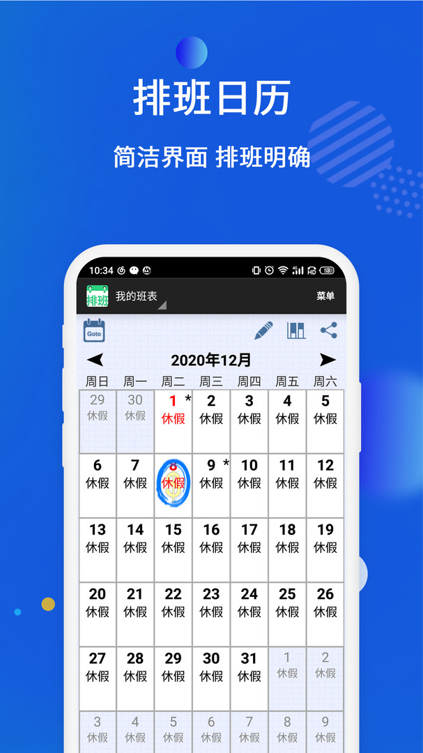 这个简单的应用程序能让您同时管理工作班次和私人日程。倒班排班表提供一款易上手的应用程序,人人都可以轻松使用。*不需要复杂的动作。对每个人来说,使用这个应用程序就和在纸质日历上用笔填写日程一样简单直接。在日历上逐项输入排班资料是一项繁复的工作。使用倒班排班表的输入排班功能, 您只需点击标记了早班、晚班、日班、夜班、以及其它班次的按键。就这样,您可以在日历上填好轮班资料,速度之快,整个月的日历仅30秒内就做好。