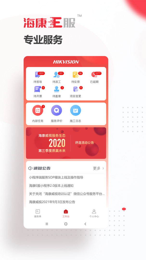 海康E服APP是一款服务运营协助工具。通过海康E服APP服务运营商可以完成售前、售中、售后的所有业务流程,轻松的管理与用户之间的关系。