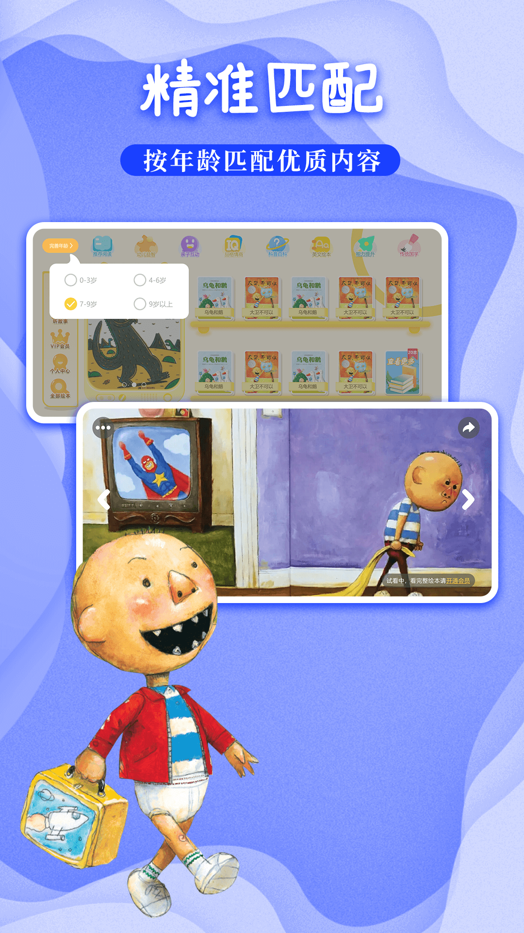 看绘本涨知识,寓教于乐,益智启蒙,早教必备!大卫不可以,霸王龙,植物大战僵尸,超级飞侠等热门内容,应有尽有!