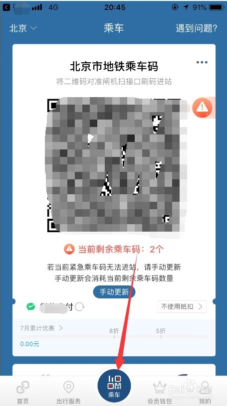 此时,就会出现乘车进站的二维码,对准闸机进站乘车即可,下次使用时点击下面的“乘车”按钮,也会出现乘车二维码,如图所示。