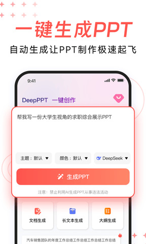 DeepPPT是由合肥战网网络科技有限公司开发的一款办公类应用,旨在帮助用户高效制作专业的PPT演示文稿。通过DeepPPT,用户可以利用人工智能技术,自动生成高质量的PPT模板和内容,显著提高工作效率。该应用支持智能化的排版设计和内容优化,帮助用户快速完成演示文稿的制作,而无需花费大量时间在设计和布局上。DeepPPT还提供多样化的主题模板和丰富的素材库,确保用户能够根据不同需求制作出既美观又专业的PPT。DeepPPT是一款功能强大的办公工具,适合各类需要进行演示制作的用户,帮助他们节省时间并提升工作效率。