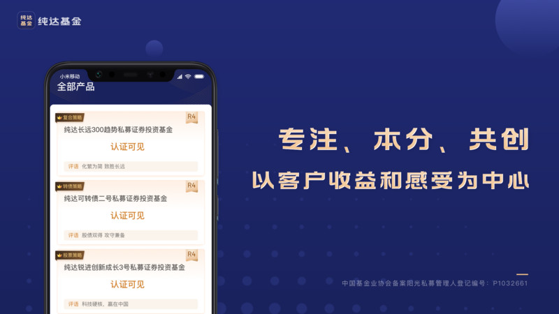 纯达概况 上海纯达资产管理有限公司成立于2016年2月17日,是一家深耕证券二级市场的私募证券投资基金管理人。 中国基金业协会备案(登记编号:P1032661),中国基金业协会观察会员; 2020年5月,获批科创板网下打新资格,分享科创红利;2020年6月,获批私募基金3+3投顾资格; 2021年10月,纯达基金获准加入上海市基金同业公会; 涵盖可转债、市场中性、股票多头3条产品线44只备案产品,管理规模超20亿; 公司团队成员超40人,背景多元,均在所负责领域具备丰富经验; 运作规范,风控严格,坚守客户利益优先。 企业文化 纯达基金始终秉持“专注、本分、共创,以客户收益和感受为中心”的核心价值观,以“肩负信托责任,创造超额收益”为企业使命,致力于成为“客户投资理财的终身伴侣”。 投资理念 守正出奇,行稳致远。坚守价值底线,兼顾成长趋势;以稳健的策略,追求长期复利收益。