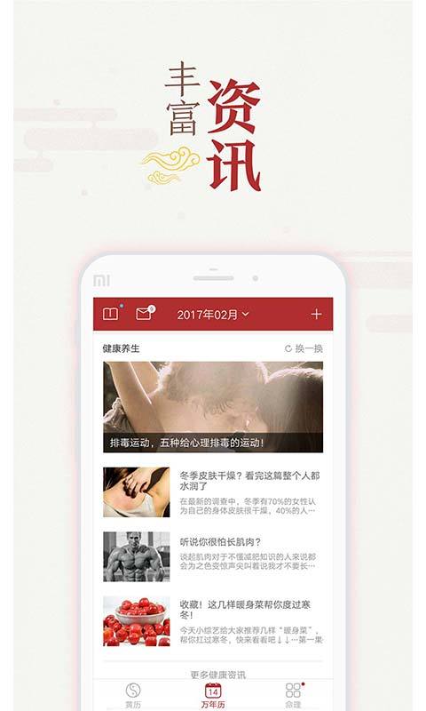 我们了解安卓用户的痛,我们不想做招人厌烦的自启和后台服务。所以,这是一款干净的工具软件,占用你极低的内存,却尽全力的为你提供*详细、*准确、*权威的农历和黄历信息。没有多余的插件,这就是一本老黄历百科全书。黄历信息包括每日宜忌、时辰宜忌、诸神方位、冲煞、五行、胎神占方、彭祖百忌、吉神宜趋、凶神宜忌、二八星宿等等。还包含了中国星座、西方星座、天干地支表示等等,是市面上信息*全、*干净纯粹的中华老黄历。