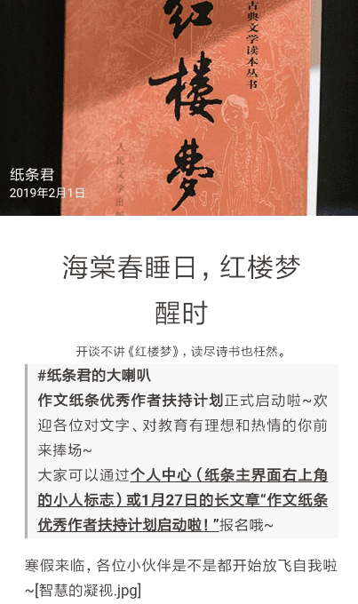 我是老师推荐才来试一试的,没想到小纸条真的超棒的!格式清晰明了,每天都有更新推荐的内容,而且很多大佬们文笔很好,小小的一篇练笔扣人心弦,常常让我与他们共鸣。很容易就能收获名家的美句,这让一直以来写作没有什么亮点的我多了很多精炼的句子让人眼前一亮。我也在小纸条上练笔过,我自认为是写的不怎么好的,但是看到大家的鼓励和赞使我很受鼓舞。