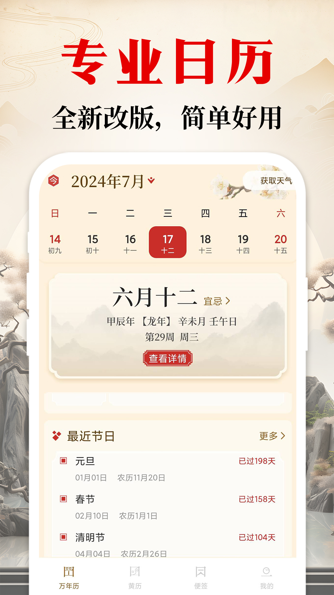 ②界面简洁,不冗余,凸显中国风,做优质准确的中国日历万年历!