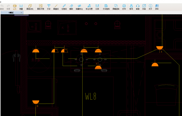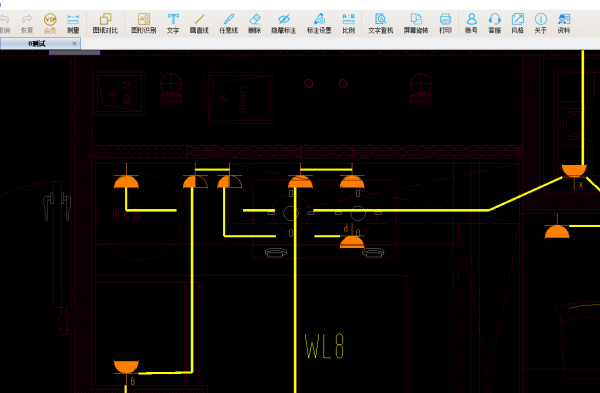 3.改变后,测量功能中所有的标注、文字标注、任意线标注都会变成更改后的颜色--黄色。
