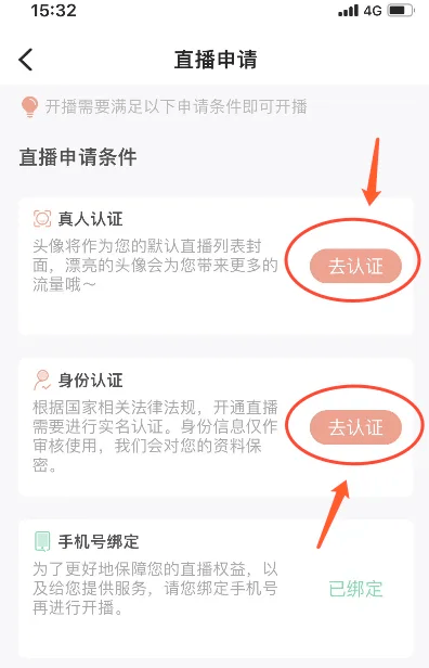最后,完成真人认证和身份认证。真人认证就是通过人脸识别,身份认证,就需要上传身份证明等材料。通过审核后,便可以开始直播了。