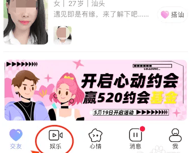 进去app交友首页后,点击第二个菜单【娱乐】