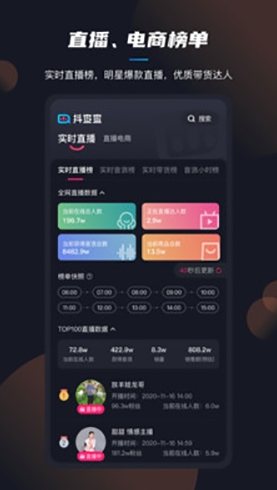 -提供热门榜单,达人直播带货榜、达人抖音小店好物种草榜、流量来源榜、涨粉榜,黑马榜,掉粉榜,蓝V榜,星图榜,热门视频榜等。