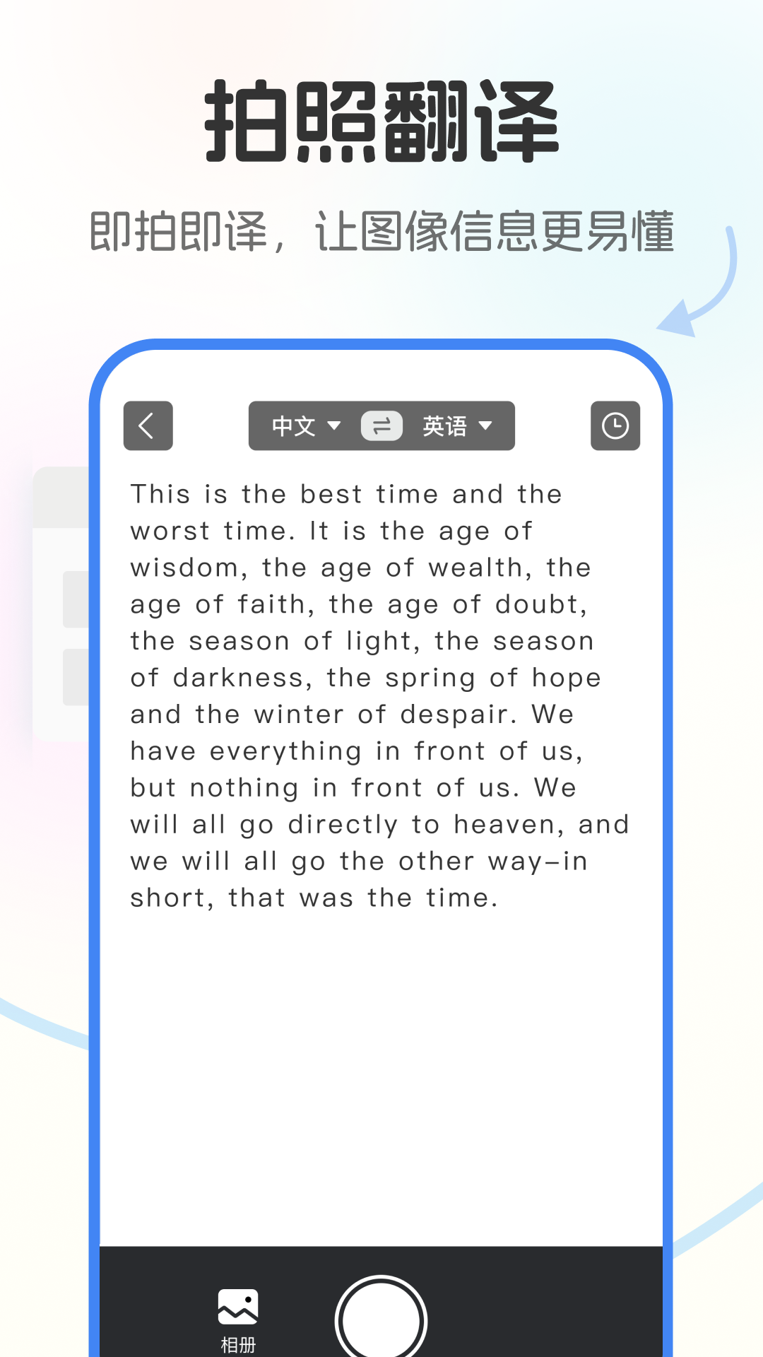 三、拍照翻译:只需拍照或上传图片,我们的拍照翻译服务即可通过OCR技术识别并翻译图片中的文字。这项服务识别准确、翻译迅速,特别适合在旅行中遇到语言障碍时使用,让您的国际旅行更加顺畅。