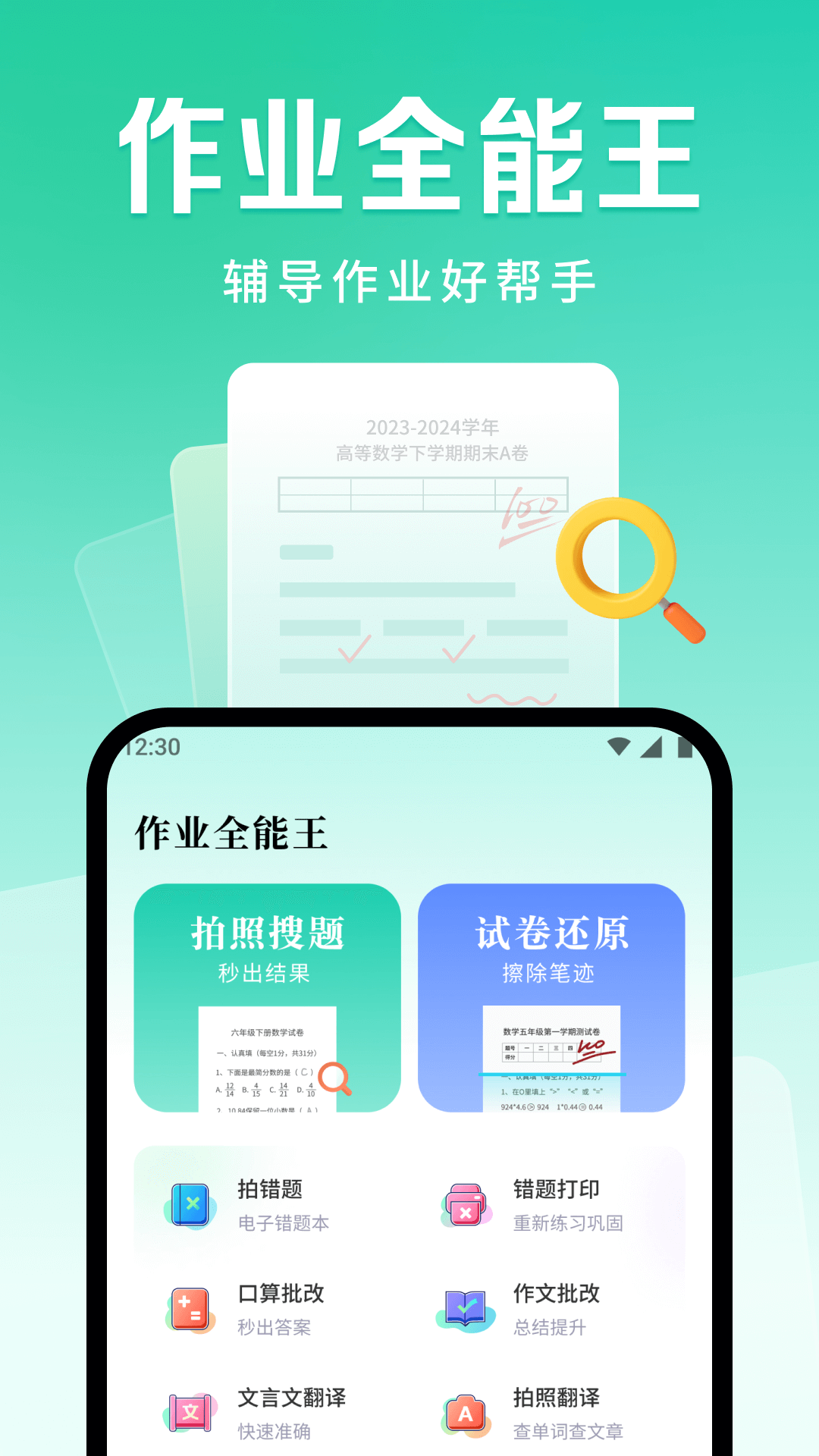 作业全能王是一款集拍试卷、拍笔记、拍错题、试卷擦除、口算批改、文档扫描、文字识别、拍照翻译、证件扫描、PDF文档转换等功能于一体的智能扫描软件,可以帮助用户方便快速地扫描试卷、作业、笔记、错题等,是学生、家长、教师、培训机构等人员得学习、办公好助手。