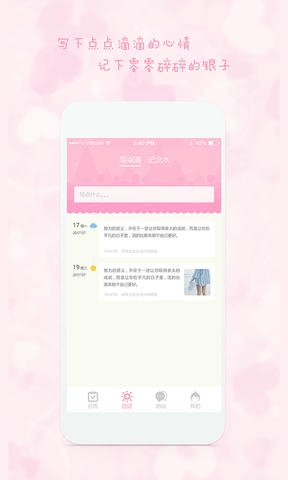 2、写点滴:记录生活点滴,来写一写今天的心情吧,每天记录一点,让点滴成为回忆。