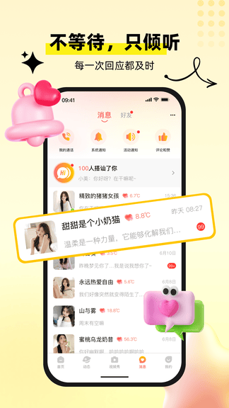 真人视频:流畅无卡顿的连接,让你随时随地与好友开启面对面交流,捕捉对方每一个眼神、每一丝微笑,感受声音与画面交织的真实温度,仿若对方近在咫尺,沉浸于亲密无间的沟通氛围。 高效回复:避免漫长等待,让交流节奏紧凑明快,畅所欲言不卡顿,让每一次互动都高效流畅,让每一条消息都被认真的对待,节省你的等待时间成本。