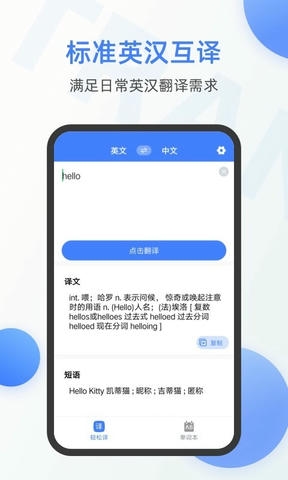 强大实用的英语翻译应用。全新领先的翻译引擎,让中英互译变得更加可靠有保证。能听会说的语音翻译,1、语音实时翻译到语音,支持中英互译即时播报。 2、支持即时语音翻译功能,是您的随身翻译秘书。