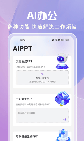 【AIPPT】 一键生成PPT:只需输入主题、关键词和要点,系统便会自动匹配模板、素材和排版,短时间内生成一份精美的PPT。