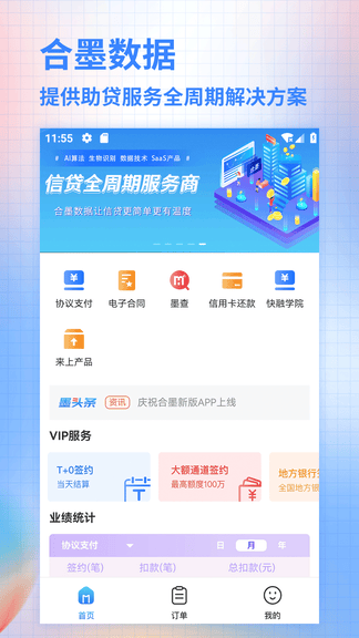 合墨数据App是一款服务于金融机构及助贷公司,帮助企业业务实现移动化高效展业的手机客户端,与企业后台业务管理系统实时联动,提供多种服务工具以及商户渠道管理等功能,致力于为企业提供数智化、一站式的信贷展业全周期系统解决方案。