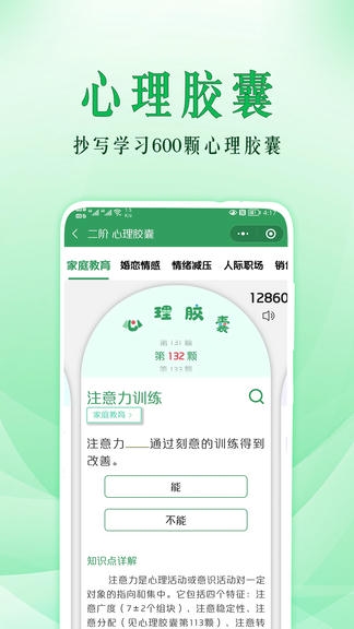 学习内容:600个心理知识点及8门心理学课程。600个心理知识点(文字内容),每一个知识点对应一个生活问题,用心理学专业词汇做出解释并提供应用方法。8门心理学(视频+音频),实现家庭教育+心理学全方面学习。