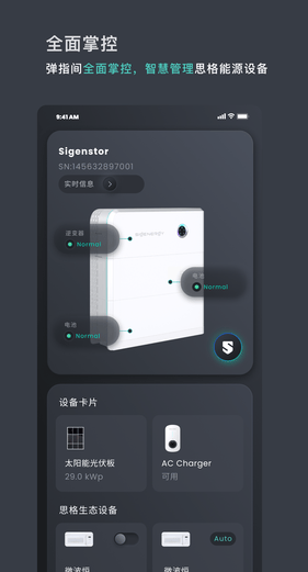 思格云App是管理思格家庭能源系统的强大工具,具备实时能源监控、可视化呈现等功能,指尖尽享便捷操控。实时查看能量流信息,支持以统计图表显示,全面了解家庭能源生产和消耗情况。使用思格云,用户可根据个人喜好定制家庭能源系统。个性化设置灯带,让灯语与家庭氛围完美融合。