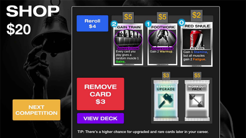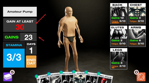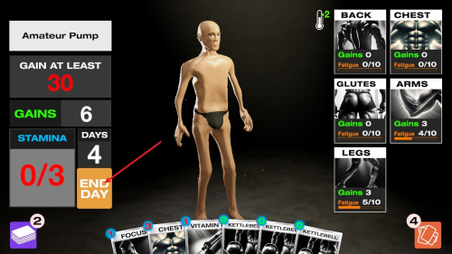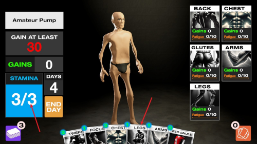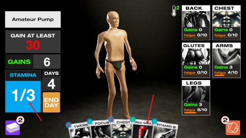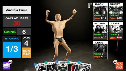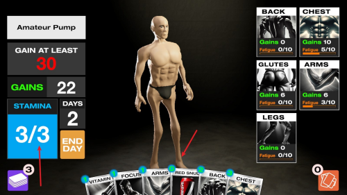 1、游戏中主要通过打出卡牌来进行健身训练,每张卡牌都会消耗左侧显示的能量值。