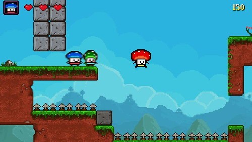 3、游戏是一款横版街机游戏,通过控制三个蘑菇通关。