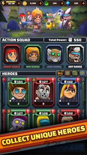 收集各种各样的英雄,比如一个投掷爆炸的大脑的僵尸,挥舞手榴弹的足球运动员,火箭筒绑缚的士兵,有毒气体的疯狂科学家,等等!在战斗中释放出特殊的力量,如眩晕手榴弹.螺旋火箭.护盾等等。给你的英雄加电并升级,以解锁新技能并造成更多伤害。