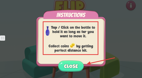 1、进入游戏后先阅读操作提示,点击CLOSE按钮关闭说明,即可开始操控水瓶进行跳跃挑战。