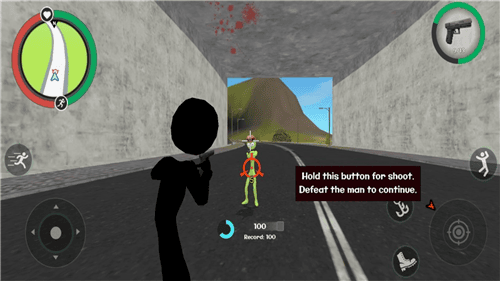 左侧移动、加速,右侧绳索,攻击(跳跃),跳跃,右上侧的武器更换以及血量、经验的显示都实时更新,一览无遗,凭借着大家自由的玩法,与其他帮派的人物进行交火,期间杀人能够获得经验,杀多了会产生星级,警察和其他附近角色会特殊照顾你对你展开火热的进攻,而如何存活,如何将其他人物击杀则是你所需要完成的任务。